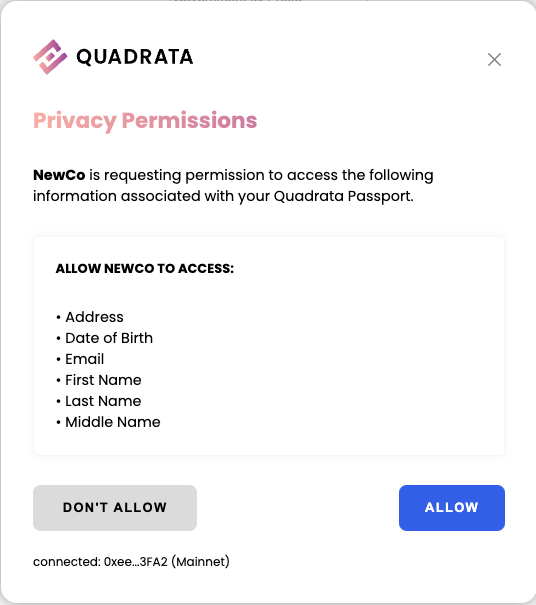 In order to use this feature, application owners must have a working implementation of the Quadrata Client. Examples and integration steps can be found in the following onboarding pages:[5.-privacy-data-permissions](https://docs.quadrata.com/integration/how-to-integrate/onboard-users/individual-passport-onboarding/5.-privacy-data-permissions "mention") and \[[6.-full-example](https://docs.quadrata.com/integration/how-to-integrate/onboard-users/individual-passport-onboarding/6.-full-example "mention")]\(onboard-users/individual-passport-onboarding/6.-full-example)
